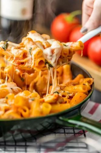 This quick and easy chicken parmesan is perfect for weeknight dinners. Diced chicken breast is cooked with Italian dressing and made tender by the tomato sauce. Combine it with rigatoni and top it with mozzarella and parmesan for a real treat. Get the recipe here.