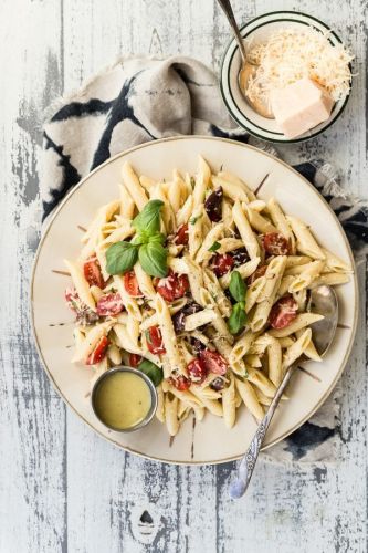 Sometimes all you need is a little garlic and a few tomatoes to turn your humble pasta into something noteworthy. In this recipe, olives, tomatoes, cheese, herbs, and garlic are tossed with pasta and a delectable mustard sauce.