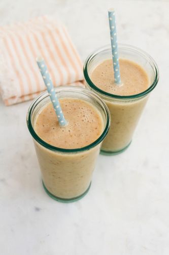 This 4-ingredient shake is not only vegan, but it also has no added sugar. Bananas and dates add their own natural sweetness and make this treat one you won't want to put down. Get the recipe here.