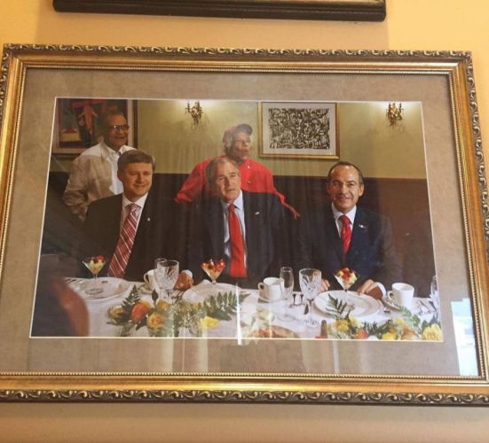 In 2008, George W. Bush hosted a private breakfast with then-Mexican president Felipe Calderon (far right) and then-Canadian Prime Minister Stephen Harper (bottom left) at legendary NOLA Creole spot, Dooky Chase's Restaurant. The night before, Bush had invited chef Leah Chase (pictured behind him) to dinner at Commander's Palace, where he asked her to cook breakfast for him the next day. She obliged and later served Obama before and after he became President.