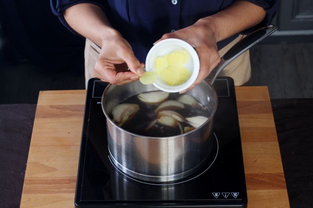 Add the slices of fresh ginger and bring to the boil over a high heat. Then cover, lower the temperature and allow to simmer for at least 20 minutes.