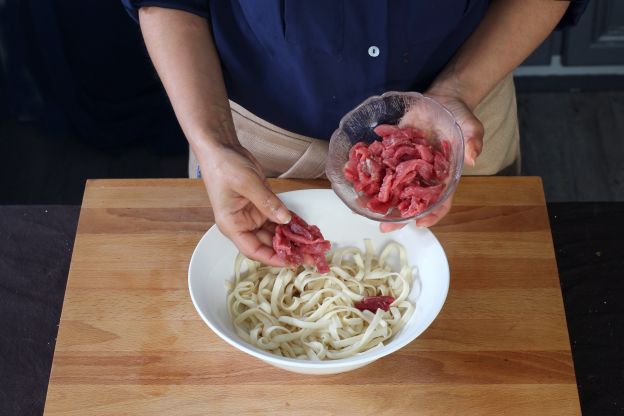 When you are ready to serve the soup, half fill your bowls with the noodles, then place some steak strips on top.