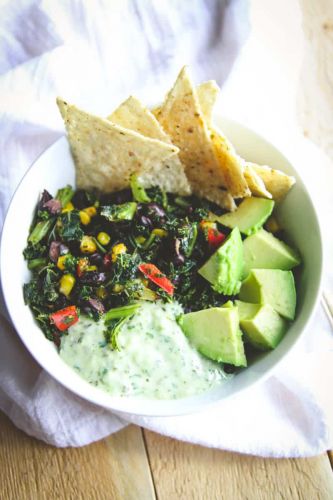 This 20-minute sheet pan recipe makes a meal you can eat with your hands. Kale, corn, peppers, and beans are roasted in the oven, then paired with avocado slices and a refreshing avocado yogurt sauce. Enjoy this dish with some tortilla chips for a delightfully easy dinner.