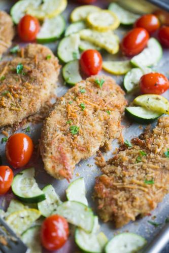 No need to break out the frozen chicken tenders for dinner—these are a lot more flavorful! Breaded with garlic, parmesan, herbs, and more, these chicken tenders bake up to crispy perfection in the oven and are served with summer squash and veggies. Get the recipe here.