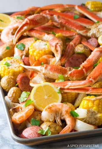 Normally, this dish is prepared in a pot and boiled, but this recipe takes a low country boil and turns it into a low country broil. Shrimp, sausage, crab legs, potatoes, and corn are tossed with butter, seasoning, and herbs and cooked to perfection.
