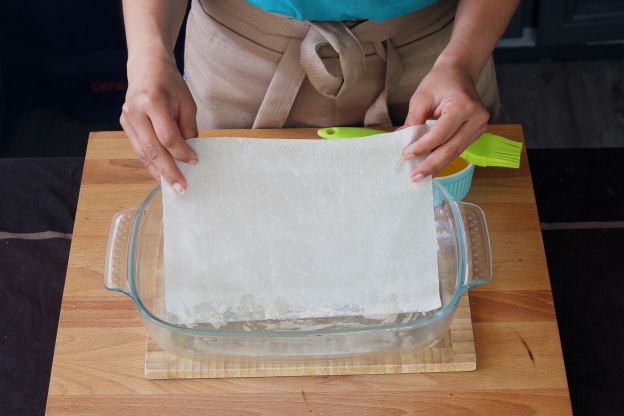 Repeat with the remaining 19 sheets of phyllo pastry, placing one sheet on top of the first, brushing it with butter and topping with another sheet.