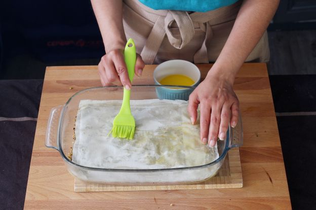 Top with the remaining 20 sheets of phyllo pastry, buttering them as you go along with the brush. Generously brush the final sheet with butter.