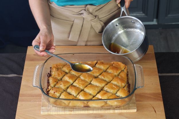 As soon as it's out of the oven pour the syrup onto the hot baklavas. Let cool completely before serving.