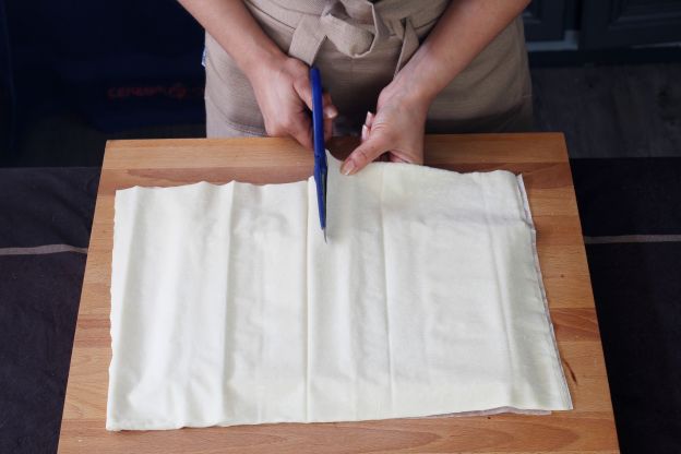 Preheat the oven to 350 °F. Cut down the middle of the 20 phyllo pastry sheets in order to get 40 smaller sheets