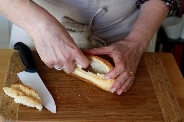 Dig out the insides of the bread with your fingers to make a "boat." Repeat the previous steps with the remaining 3 rolls.