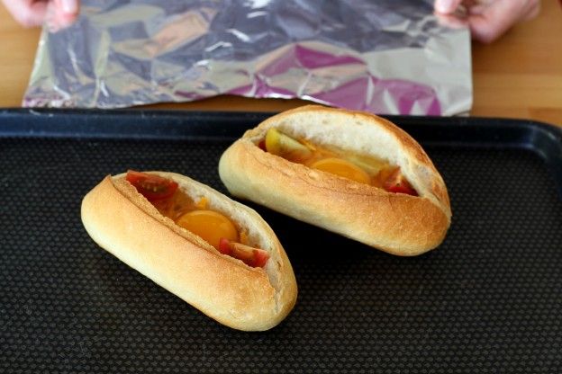Cut 2 cherry tomatoes in half for each boat, and place the halves inside at both ends. Place the rolls on a baking sheet and cover them with aluminum foil.