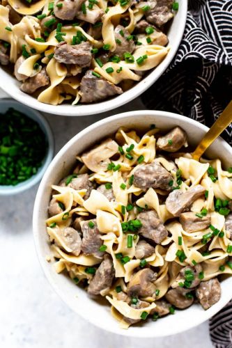Beef is cooked in a creamy mushroom sauce and served with egg noodles in this easy recipe. Red wine deepens the flavor and helps to make the beef deliciously fork-tender.