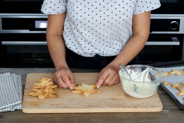 Place the next smallest star on top as shown, and top with about a teaspoon cream filling. Repeat the process with the remaining smaller stars in order of size.