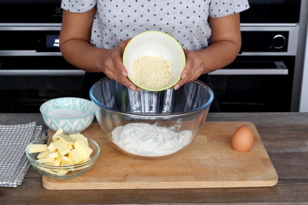 1. In a bowl, mix together the butter, egg yolk, sugar, and salt.