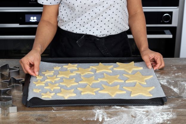 Place the star cookies on a baking sheet lined with parchment paper, and bake for 15 minutes at 350°F in the preheated oven.