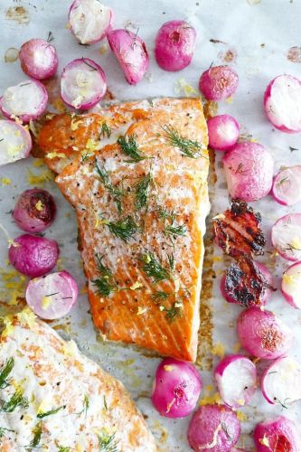 Here's another sheet pan salmon dinner, this time dressed up with vibrant radishes and fresh dill. Radishes lend the dish their crisp, peppery flavor, while dill is always a good idea when it comes to anything salmon-related. Get the recipe here.