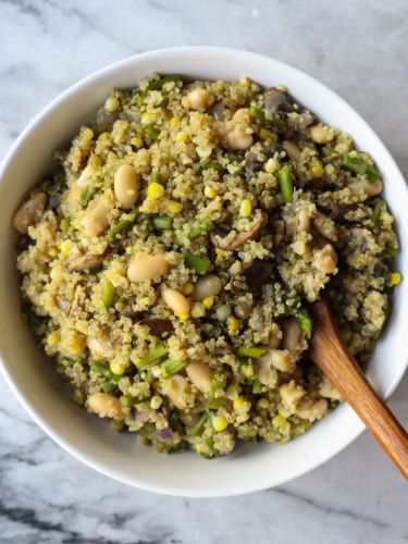 Quinoa serves as the pillar of this veggie-based dish, packed with mushrooms, asparagus, red onion and herbs. Cannellini beans add another layer of protein, and it comes together easily in a half hour. Get the one-pot recipe here.