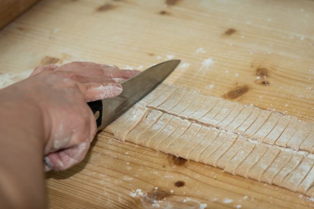 Use a sharp knife to cut the dough into strips of desired thickness. For spaghetti-like noodles, cut them thinner. For fettuccine or pappardelle, go wider. Once you gently unfurl the strips, you should have long pasta noodles.