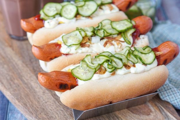 Hot dogs are a favorite Danish street food, and this recipe shows you how to make the authentic version. On top of the usual ketchup and mustard, it gets topped with remoulade—a tangy, mustardy mayonnaise—both raw and fried onions, and pickled cucumbers.