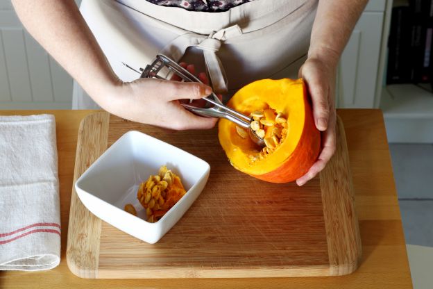 Cut the squash in half and remove the seeds with a large spoon or ice cream scoop.