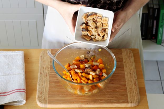 Add the croutons, and stir well to combine. Let sit for 10 minutes.