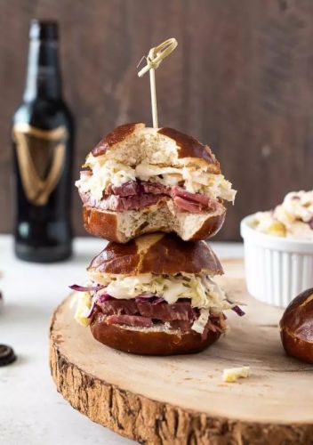 Pretzel slider rolls are the perfect bun choice for these flavorful corned beef sliders. The meat and cabbage cook up in your crockpot with a pint of Guinness beer. Make the filling a day before so you can simply reheat and serve on game day. Get the recipe here.