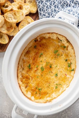 Here's a yummy crab dip that requires nothing more than dumping the ingredients into your crockpot and flicking the switch. It's got a spicy, tangy flavor profile and chunky texture, thanks to the crab meat and diced bell peppers. Serve with crackers, chips, veggies or bread for dipping. Get the recipe here.