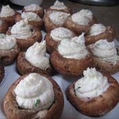 Chop stems of mushrooms. blend with remaining ingredients, reserving small amount of cheese for topping