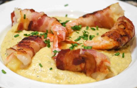 Find all the pictures we have received for this Recipe for bacon-wrapped, cheese-stuffed shrimp & green chile grits recipe.
