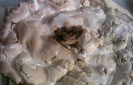 Apple pie cooked in the pie shell no pre cook. Add raisins and a vanilla frosting to complete