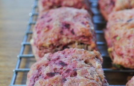 Red beet, apple and pistachio scones
