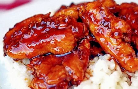 This sweet and spicy chicken is one of my favorite things to find at a good Chinese buffet and I sometimes make this lower fat version at home using baked chicken pieces instead of deep fried. Most people who have tried it say they would not have been able to tell that it was not deep fried. This recipe works well with baked chicken wings as well, some would say even better!