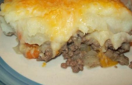 Delicious hamburger pie with ground beef,mash potato's,cream of mushroom and cheese.