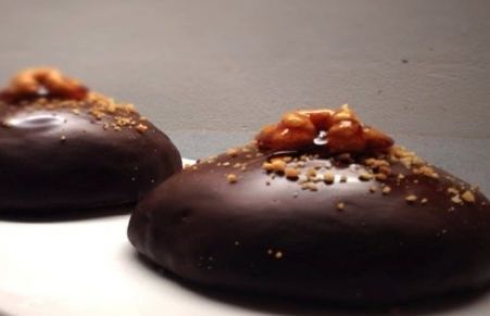 This extravagant French pastry combines many classic elements to create the "Japanese Walnut:" A praline butter cream filling complements a chocolate dressing in a cracker-choux pastry, all tied together with a caramelized walnut.