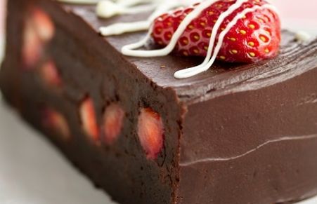 Indulge in a decadent chocolate cake dessert bursting with fresh strawberries and enrobed in rich ganache.