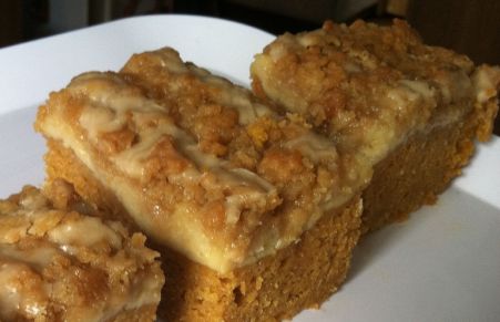 Pumpkin coffee cake with a layer of sweet cream cheese and a maple crumble