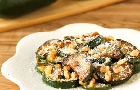 Quick and easy zucchini side dish topped with Parmesan cheese and crunchy walnuts! Works as a quick snack or lunch meal too