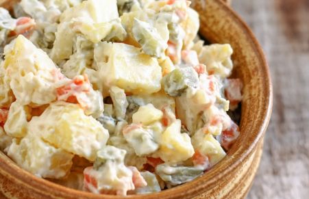 Lighter dill pickle potato salad without mustard and vinegar. This creamy salad with dill pickles is a perfect side dish or a party food.