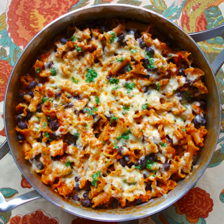 Add onion flakes, garlic powder, enchilada sauce, black beans, broth, cream, and pasta. Bring to a boil. Reduce heat to low and cover skillet. Simmer for 15-20 minutes, until pasta is tender.