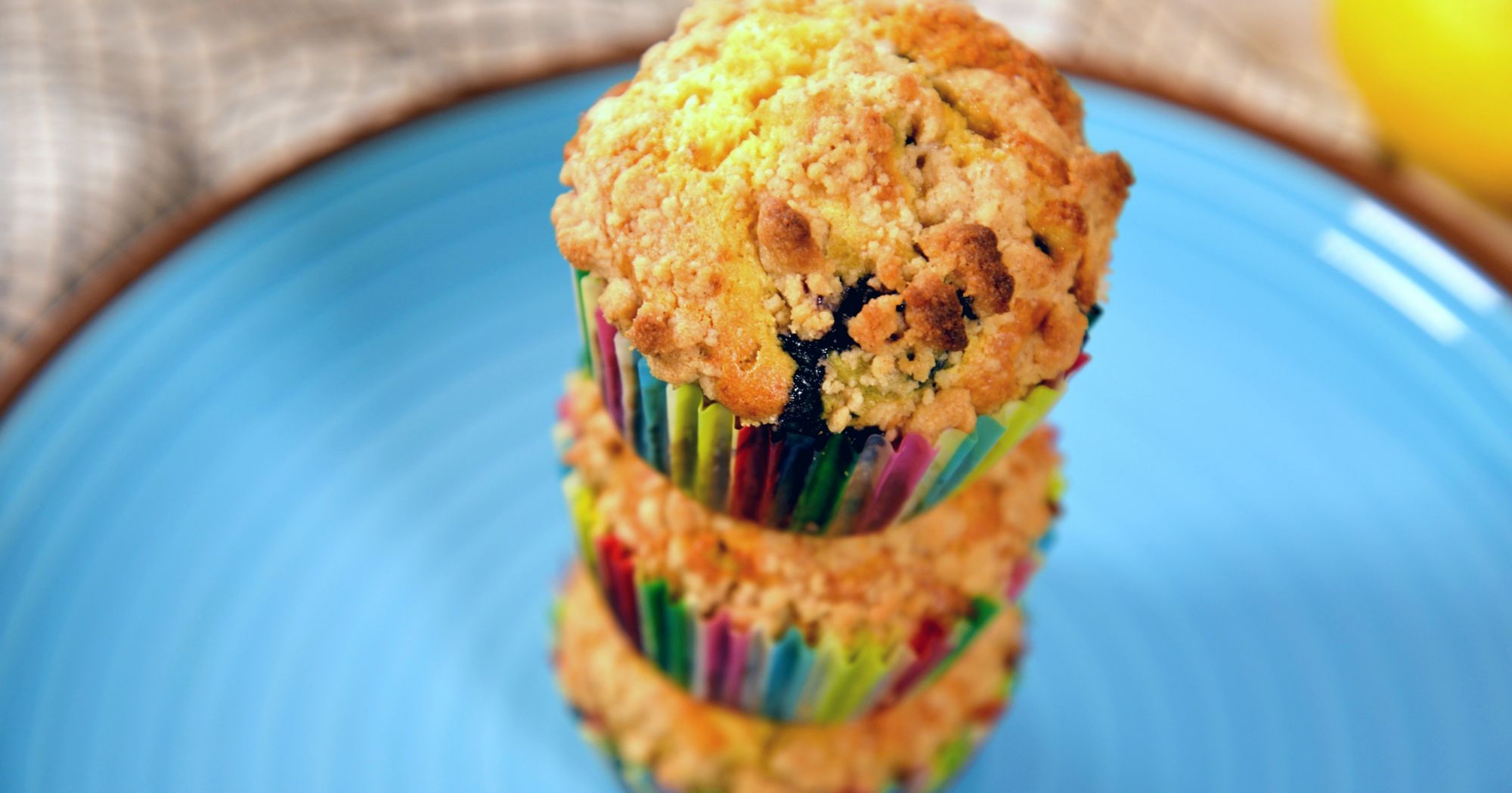 Using an ice cream scooper or large spoon, scoop batter into a lined cupcake tin, until each cup is about 3/4 full. Sprinkle crumble on top of batter and put tin on middle rack in oven.