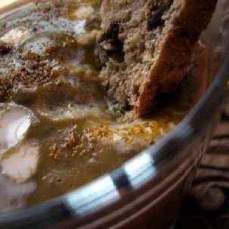 To serve, toast a few slices of bread. Pour the steaming soup into bowls, add a few drops of cream and a little curry.