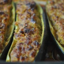 Meanwhile, cut the pepper into small pieces. When the water from the pan has evaporated and vegetables are cooked, add the diced pepper and mushrooms, salt and pepper. Cook 5 more minutes. When the zucchinis are cooked, remove from oven. Stuff them with vegetable mixture. Sprinkle with grated cheese and return to the oven. Bake for 10 minutes, or until the cheese is melted and golden.