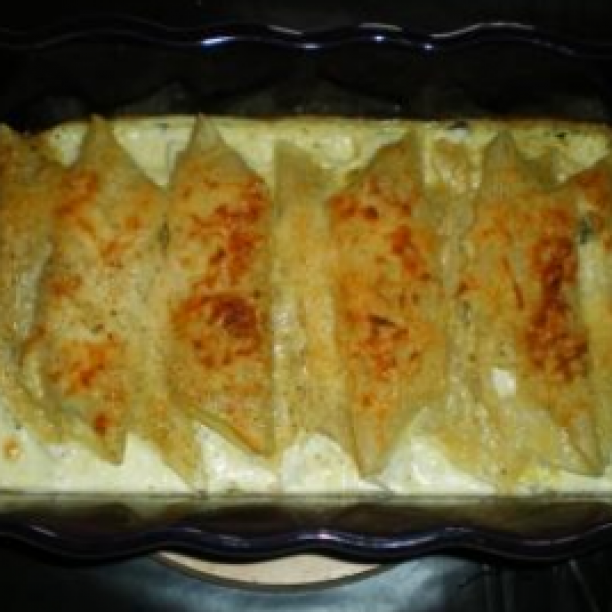 Fill the previously cooled cannelloni, and put them in a buttered baking dish. Add the grated cheese and cream. Sprinkle with bread crumbs.
