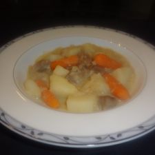 Put the onions, carrots, and meat into a pot and add the ras el hanout, cumin, turmeric, cloves, crushed black pepper, chicken stock, sprinkle with thyme, garlic and ginger, raisins and add water to cover.