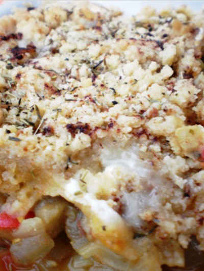 Assemble: Place the ratatouille in a square pan. Cover with crumble topping. Slide a few slices of goat cheese into the topping, then sprinkle with herbes de Provence and a little cinnamon.