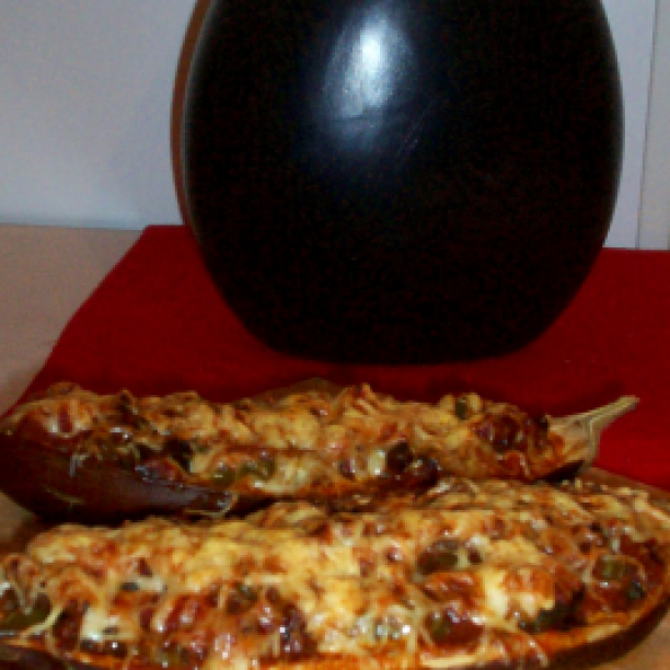 Cut the eggplant in half, keeping the tail. With a knife, hollow out the eggplant. Keep the flesh, and cut it into cubes. Cook the hollowed out eggplant at 350 ° F for 15 minutes ..