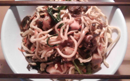In a wok fry all the ingredients with Chinese garlic and green onions cut into small pieces, add toppings sautéing one by one, mixing well.