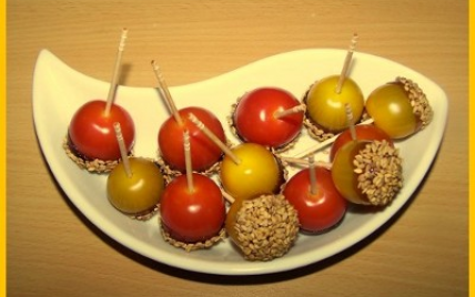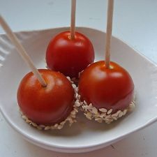 Take the cherry tomatoes by the toothpick and dip them quickly in caramel. Plunge them immediately into the sesame seeds until the caramel hardens. Reserve.