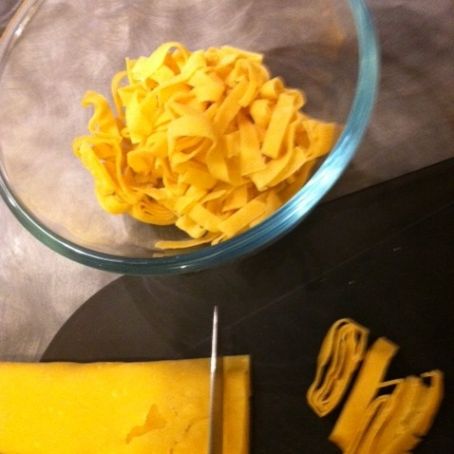 Place the noodle dough in a rolling mill in order to cut fresh pasta to the desired shape. Once cut, leave your pasta to dry on a rack or on a towel before cooking.