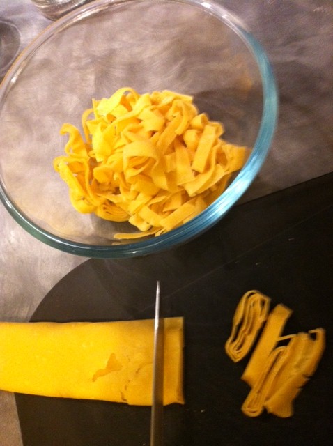 Pour the flour onto the work surface, digging a well. Pour the eggs into the well, with salt and olive oil, then immediately beat these ingredients with a fork. Begin incorporating the flour from the edges of the well.